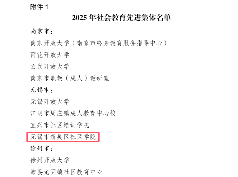 近日,江苏开放大学正式印发《关于表彰 2025 年社会教育先进集体和先进个人的通知》(苏开大〔2026〕2 号),对全省社会教育领域表现突出的先进单位与个人进行通报表彰。无锡市新吴区社区学院凭借在社会教育工作中的扎实实践与成效,获评“2025 年社会教育先进集体”。