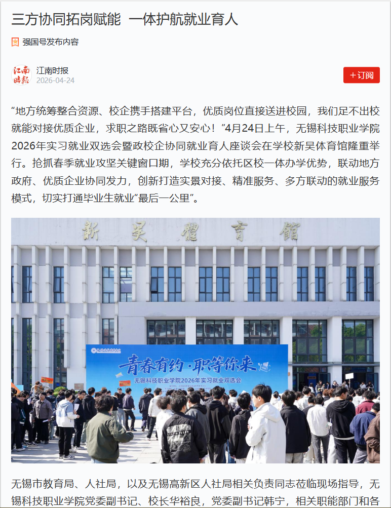 上一篇:中国江苏网:无锡科技职业学院:三方协同拓岗赋能 一体护航就业育人